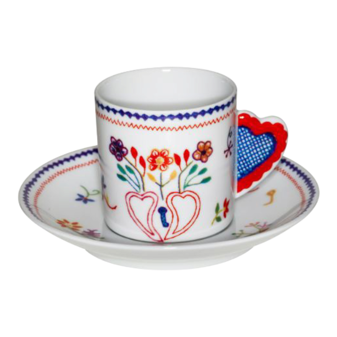 A Chávena de Café com Pires da coleção Vila Verde, da prestigiada Vista Alegre, inspira-se nos icónicos lenços dos namorados, símbolo do folclore e da tradição afetiva portuguesa. As ilustrações em porcelana evocam sentimentos puros e mensagens de amor bordadas com arte e história.